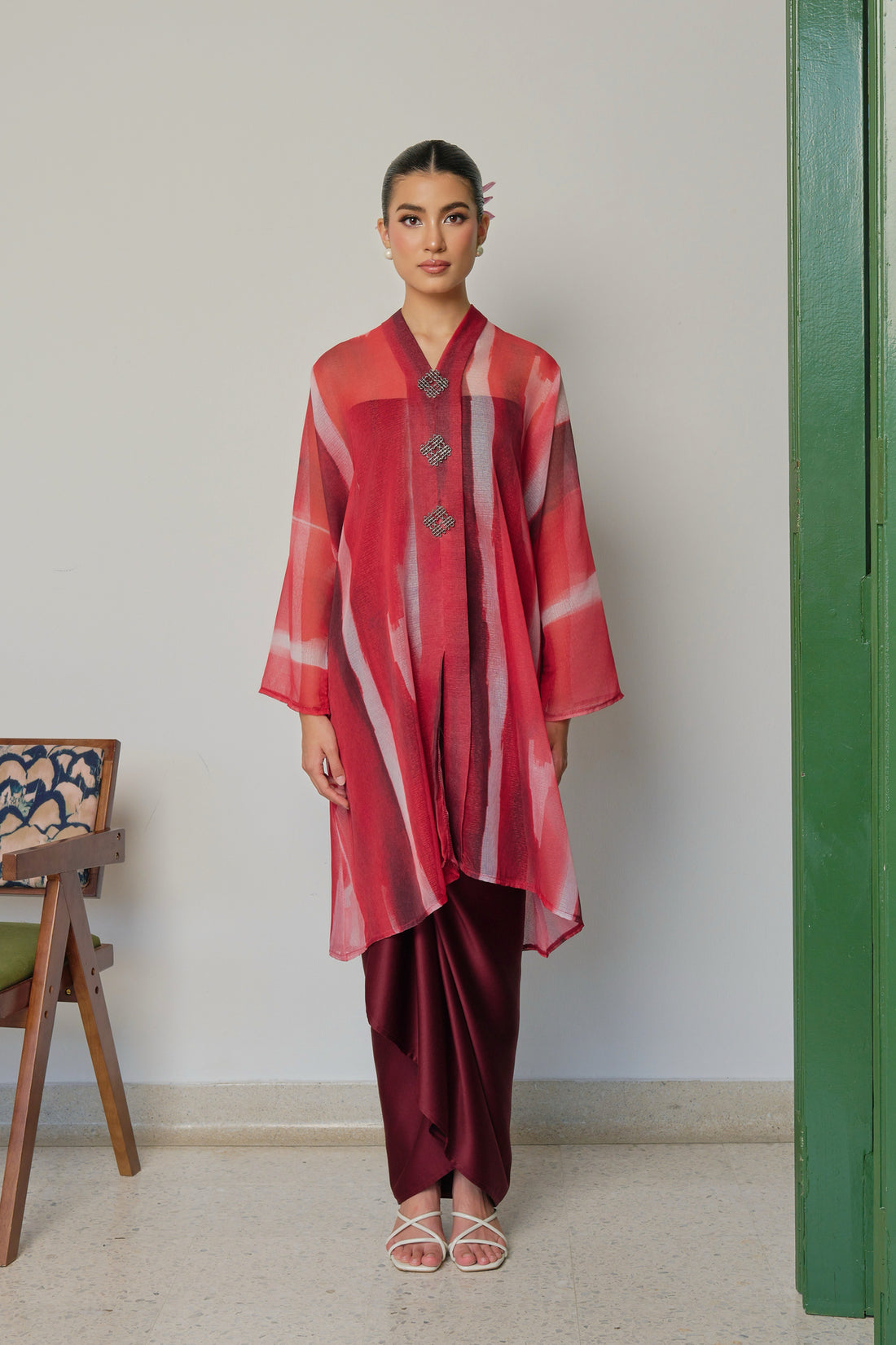 Product details: * Printed organdy kebaya labuh and plain satin pario* V-shape neckline* Shawl included...