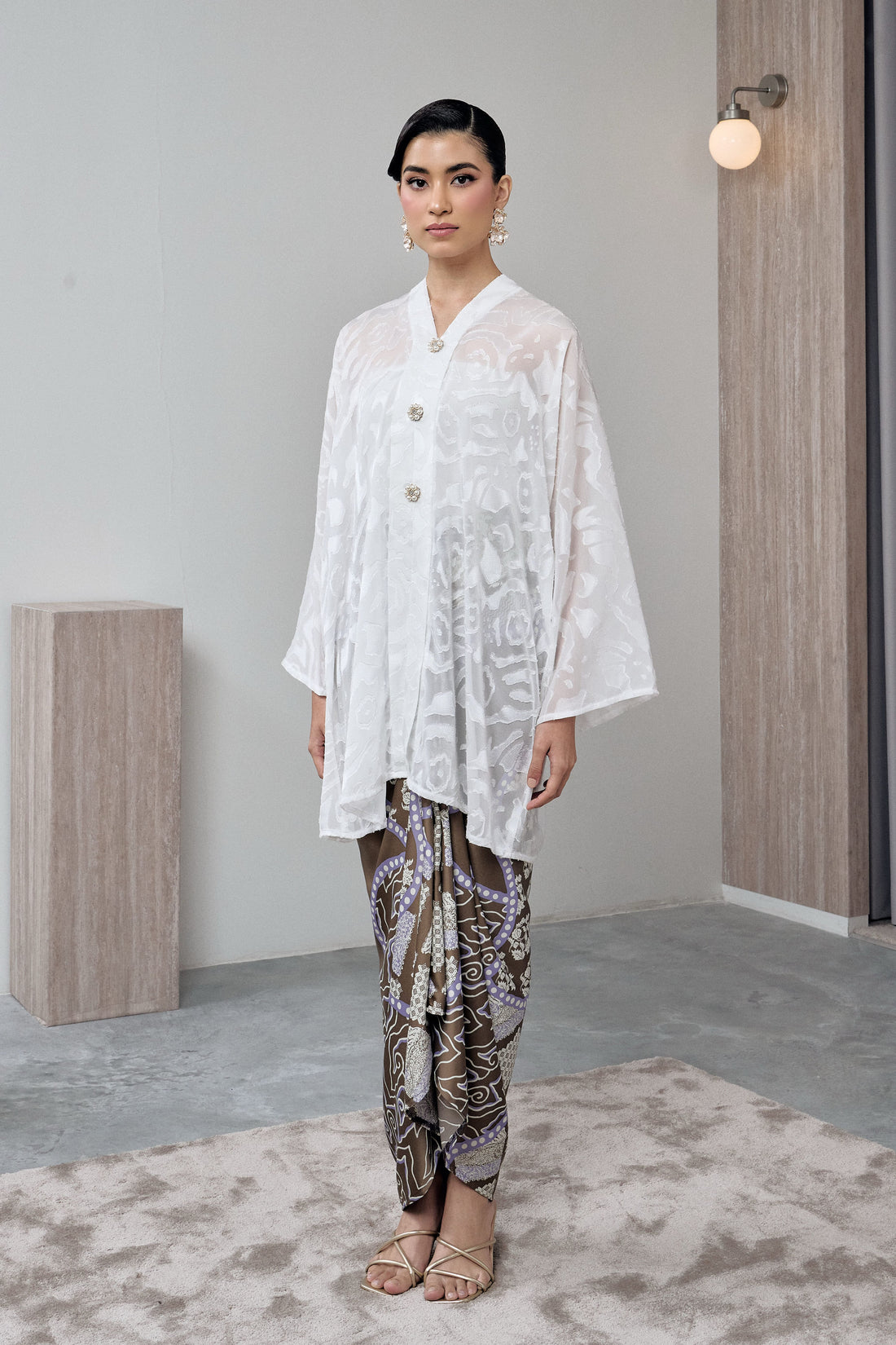 Product details: * Printed organdy kebaya labuh and plain satin pario* V-shaped neck* Veil/selendang included...