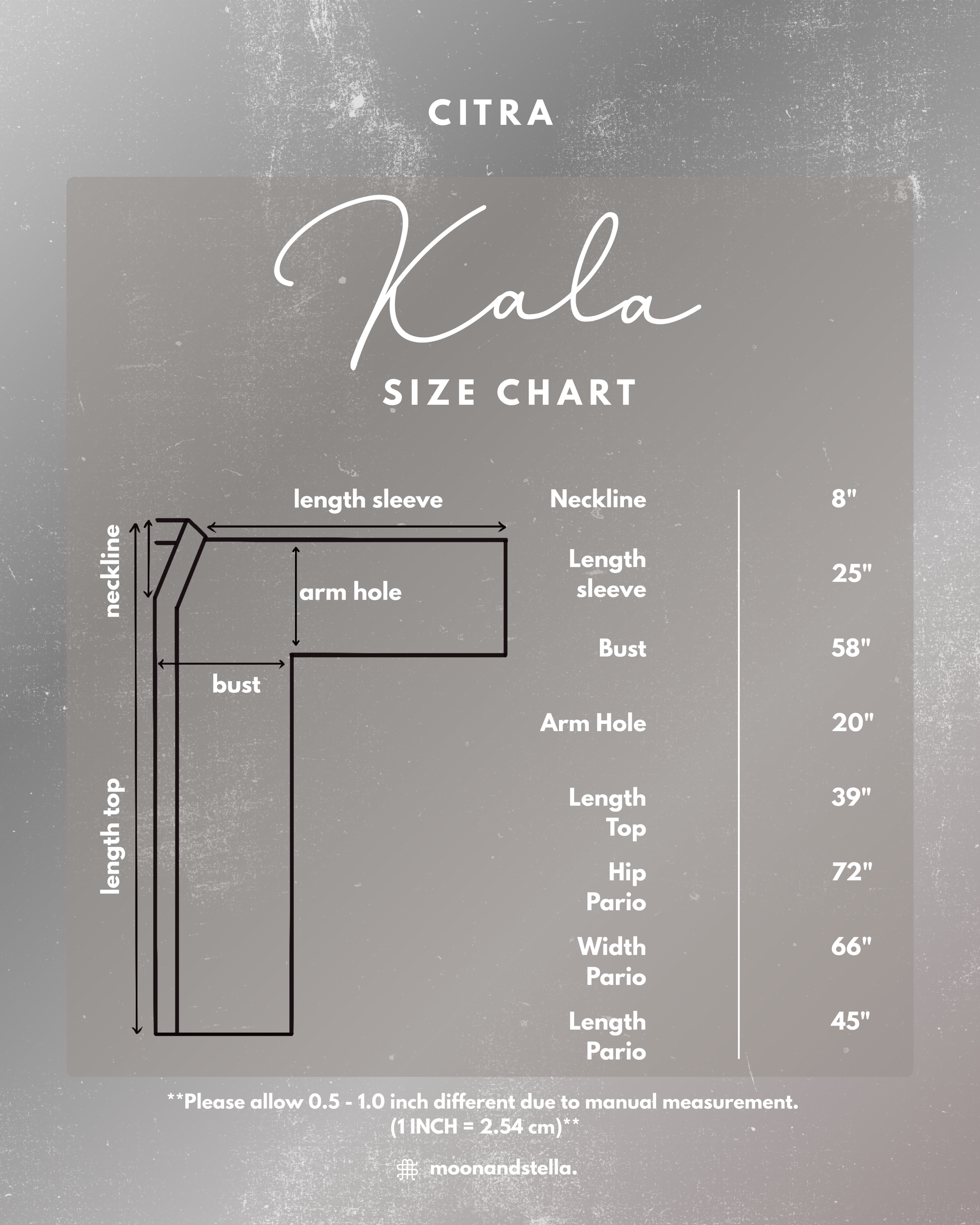 * Please allow 0.5 - 1.0 inch different due to manual measurement. (1 INCH = 2.54 cm)