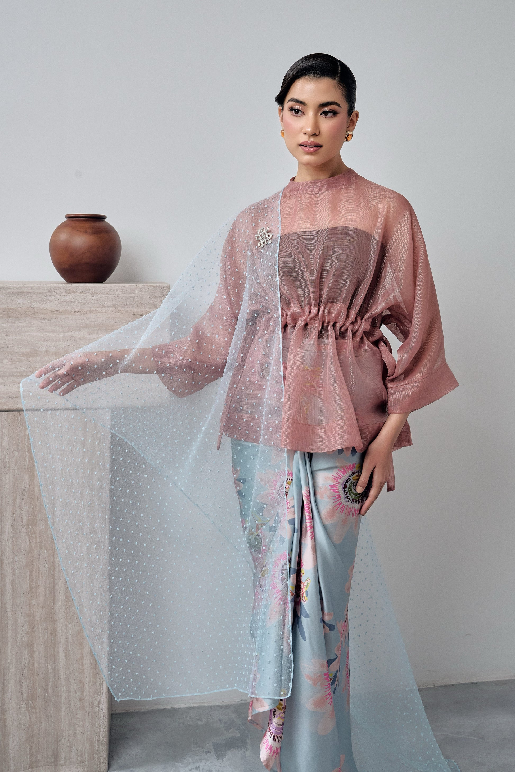 * Sheer Drawstring Organdy Top & Printed Satin Pario